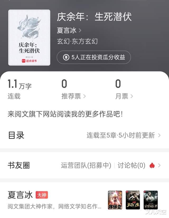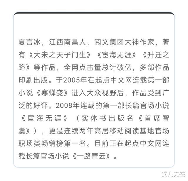 夏言冰是以前的官场小说大神,写过《宦海无涯》《升迁之路》《一路青云》等等,只是大家都知道官场小说很早就成了限制题材,很多官文大神不得不转型去了,就是转型成功的并不多,目前比较活跃的就是瑞根。
