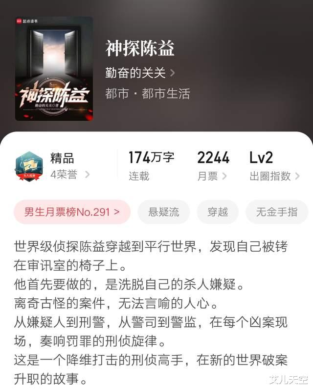 “勤奋的关关”的这本神探文在昨天晚上拿到了万订徽章。