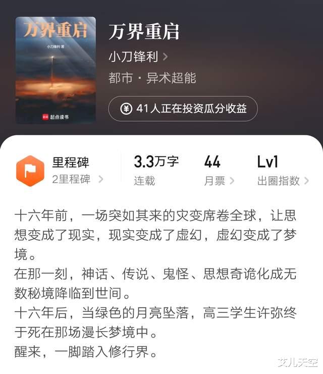 新书《万界重启》上周五开的,大灾变后的未来世界,又有绿色月亮的影响,神话传说、诡异秘境这些也都是比较流行的元素了。