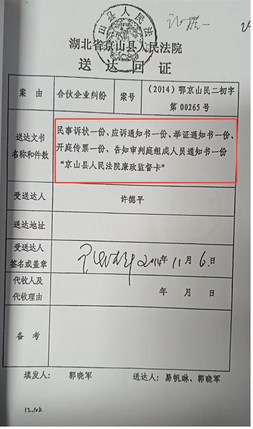 据许德平介绍,其系(2014)鄂民二初字第00265号合伙协议纠纷案的被告及被执行人,该案自2014年立案审理以来,一系列违背司法程序、偏离案件事实的操作,让他深陷维权困境。“一场本该公正严谨的司法审判,却充斥着串通造假、程序失守的乱象,我耗费数年时间奔波举报,只为还原真相,讨回公道。”许德平的举报材料中,详细罗列了该案审理过程中的四大核心违法事实,每一项都直指司法公正的底线。