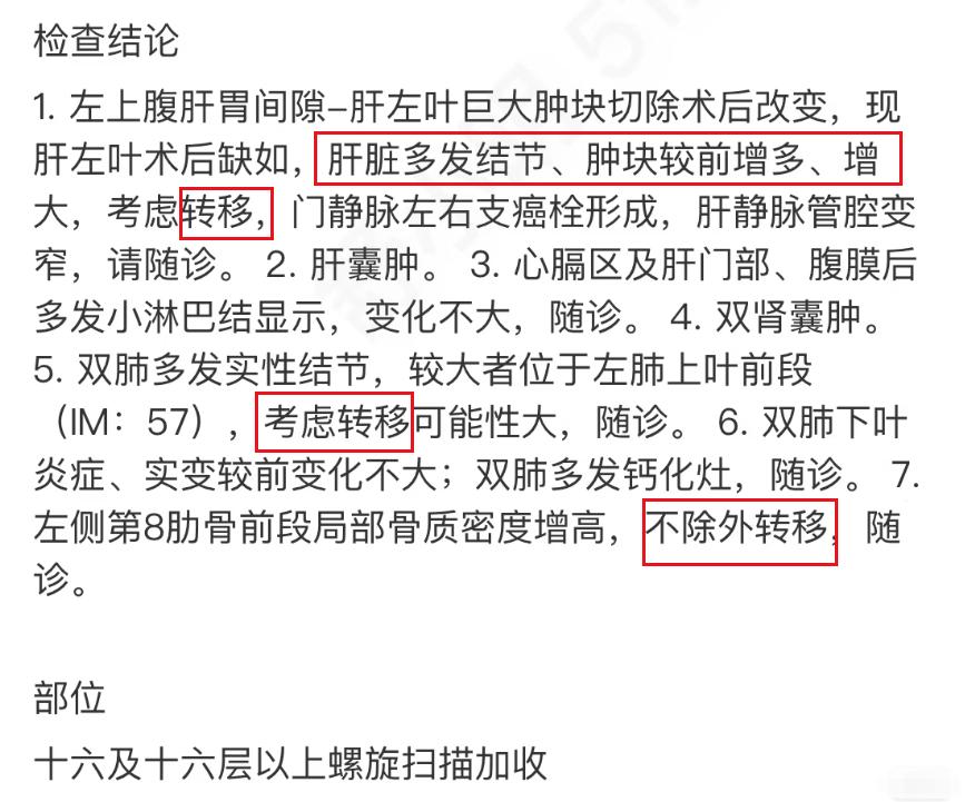 肝脏多发结节、肿块较前增多、增大,门静脉左右支癌栓形成,肝静脉管腔变窄,这些都是肿瘤复发转移的直接证据。双肺多发实性结节,考虑转移可能性大;左侧第8肋骨前段局部骨质密度增高,不除外转移可能。这些发现表明,肿瘤已突破肝脏局限,形成广泛转移。大大加重了后续治疗复杂程度。