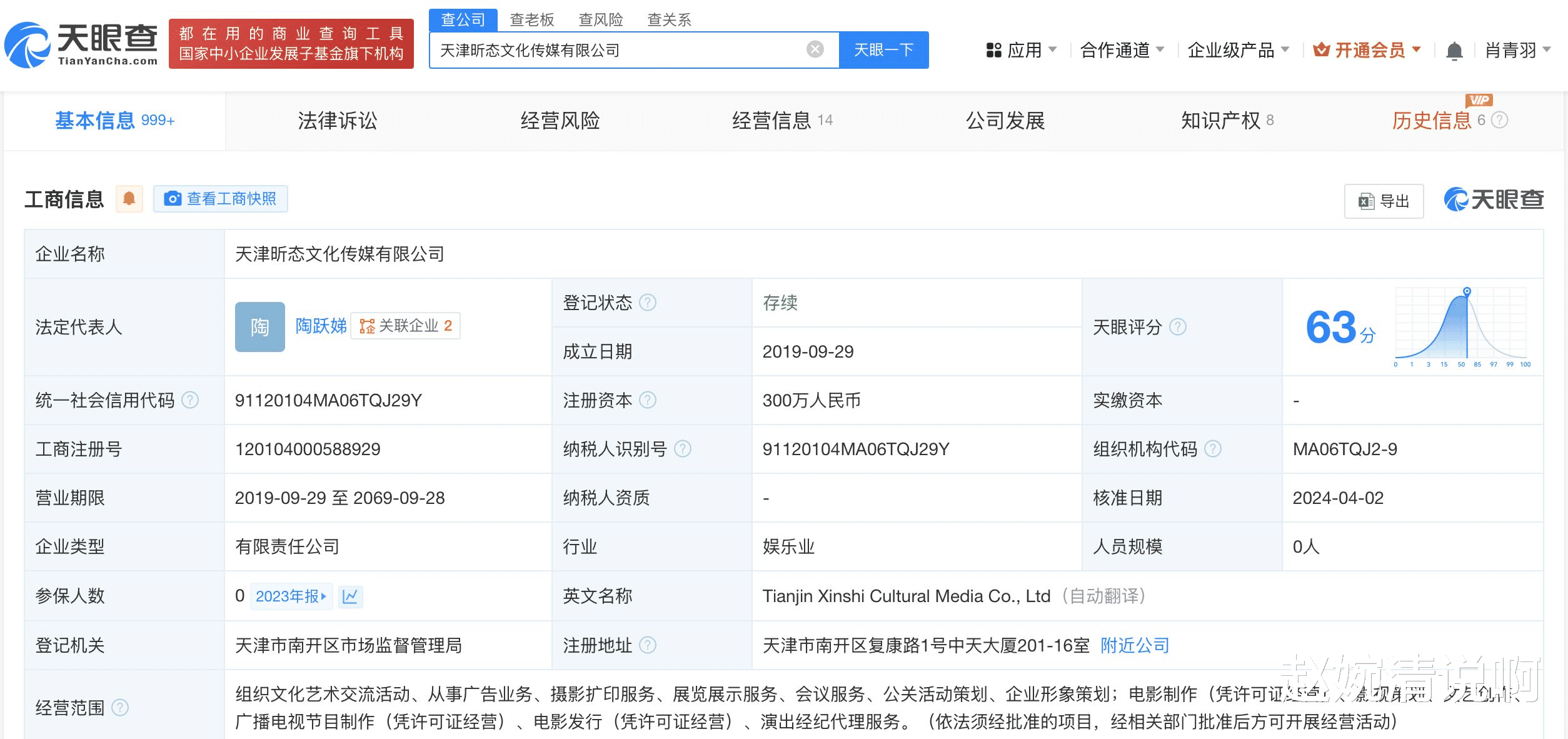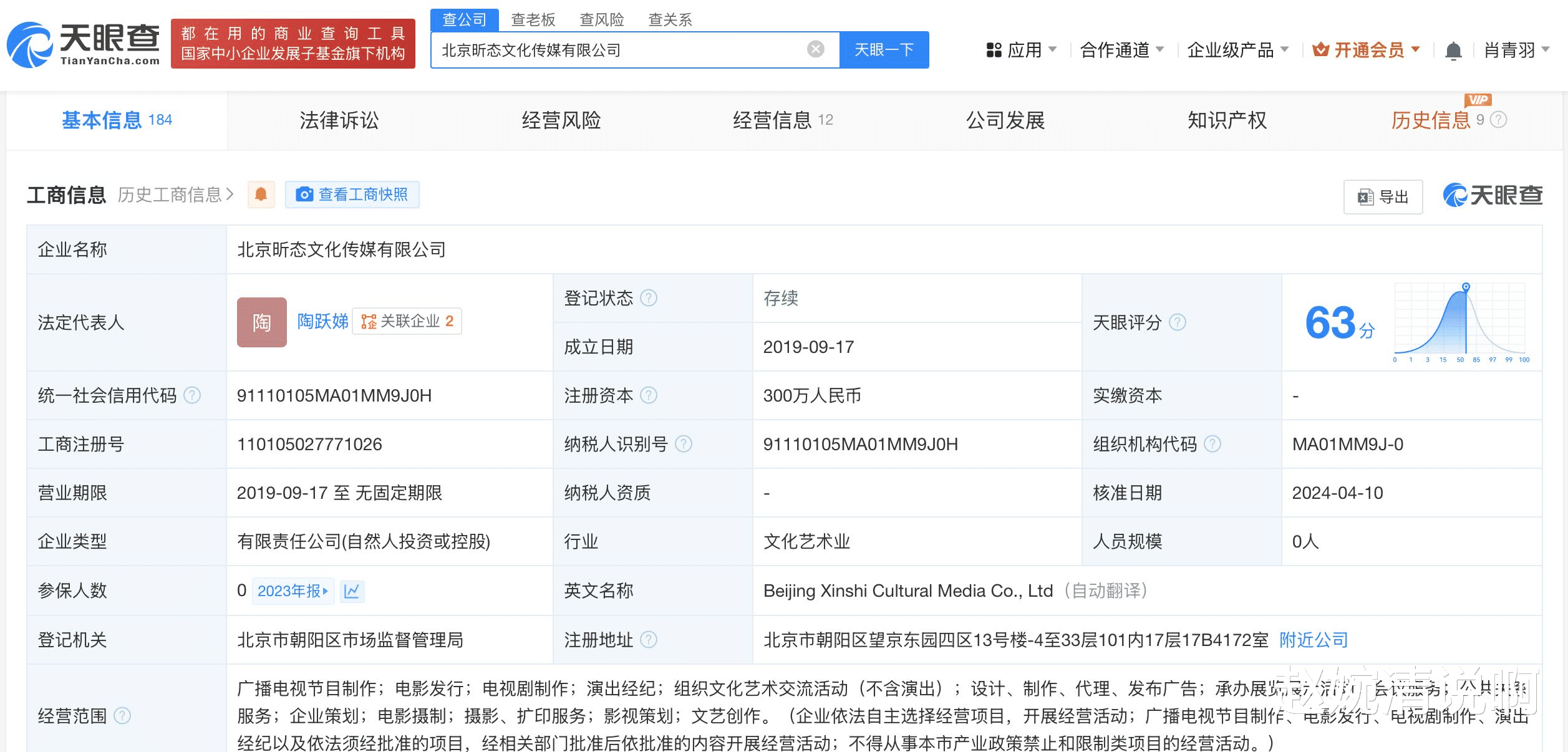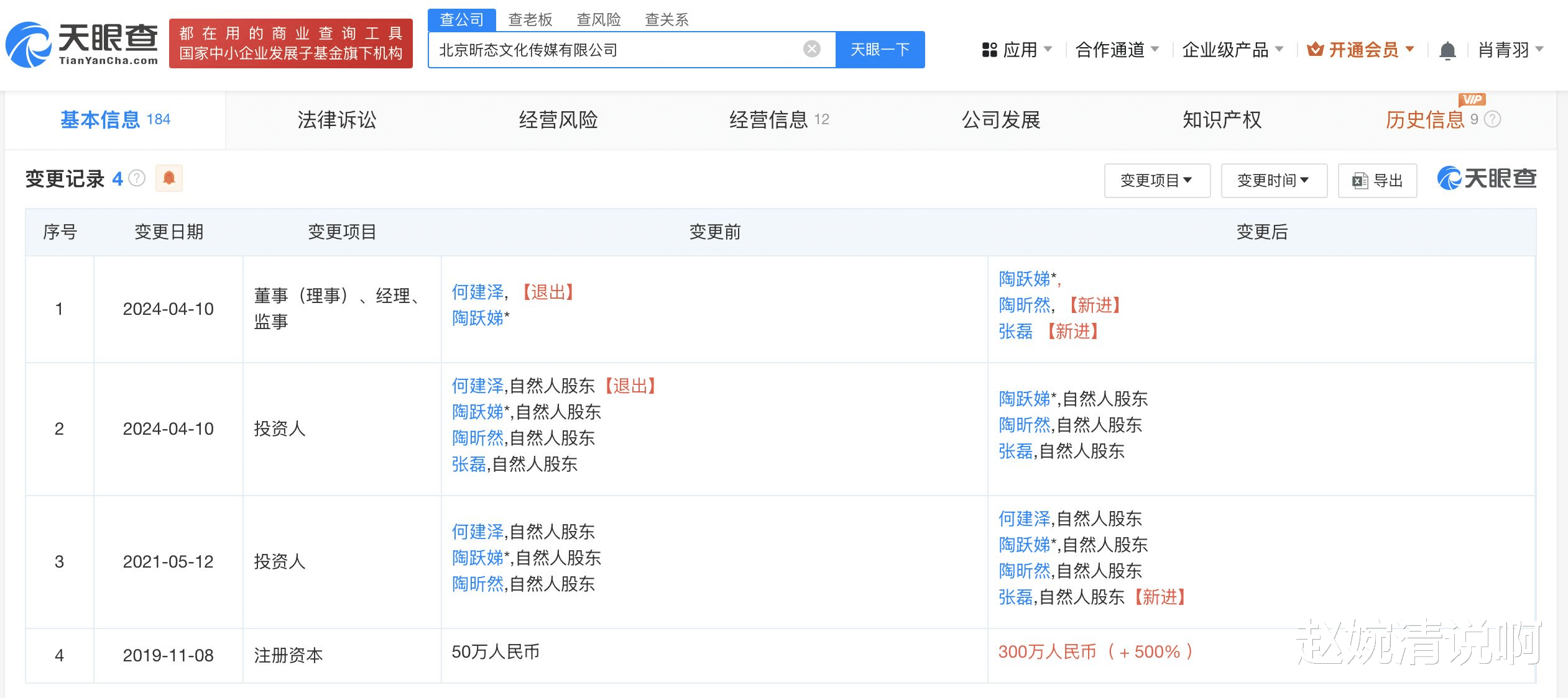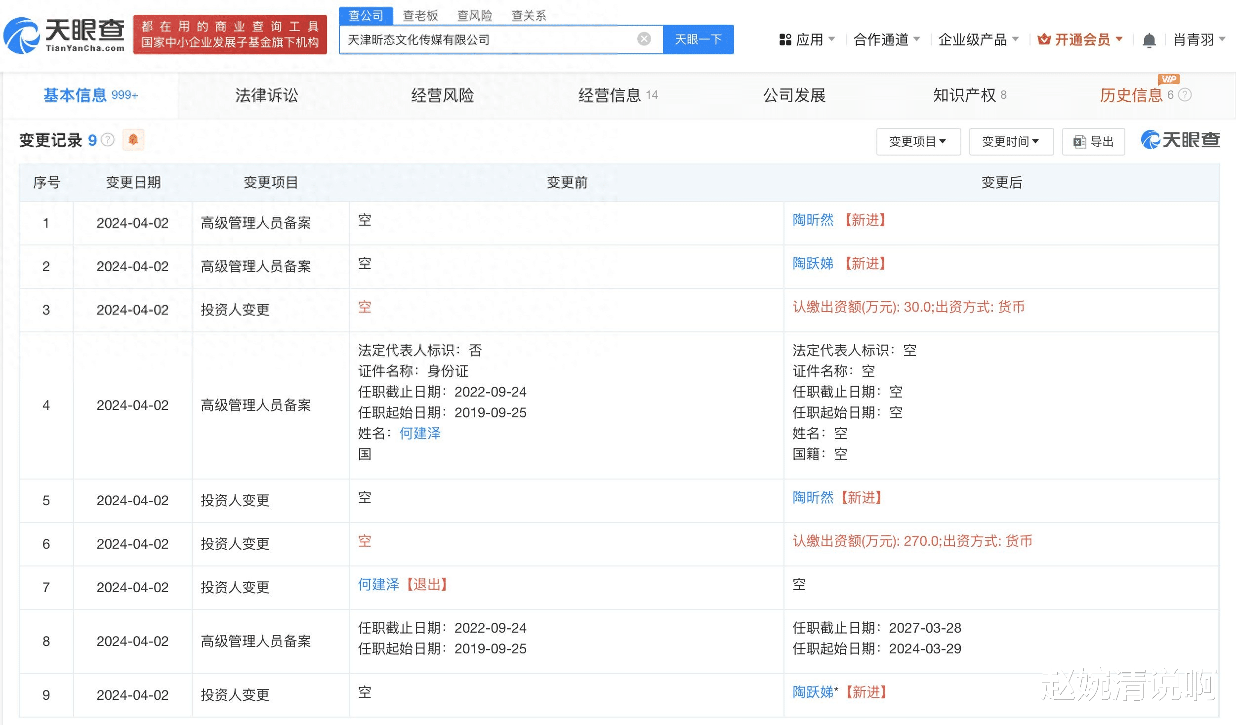 在天眼查的数据库里,天津昕态文化传媒的股权变更记录像部无声的纪录片。这家注册资本仅10万元的小微企业,曾是夫妻档创业的见证。从2015年领证到2024年拆伙,他们的商业版图始终与婚姻关系同频共振。最新的企业信息显示,陶昕然名下的影视工作室与文化公司已完成去夫妻店化改造,何建泽彻底退出核心管理层。