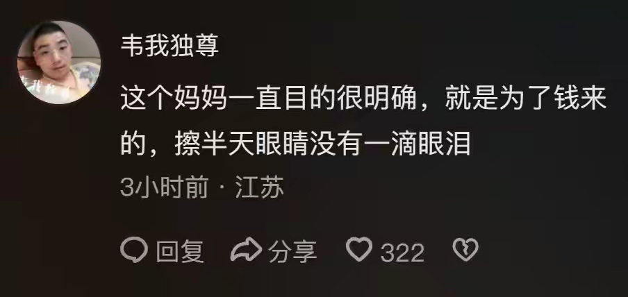 生母在边上抹眼泪,眼睛通红。但网友后来翻视频发现,那眼眶红像是拿纸擦出来的,没见几滴泪。生父坐在旁边一言不发,偶尔红了眼眶,鼻涕流到下巴也没擦。