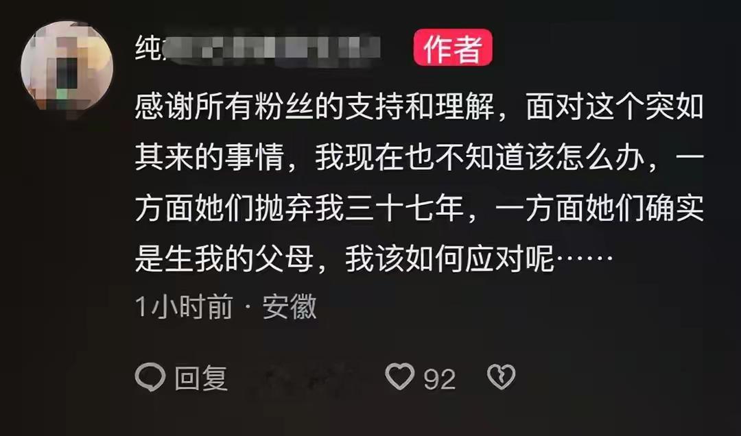 网上很多人说,生而不养,断指可还。亲生父母如果真想认亲,就不该带着目的来。纯女士这37年,是自己一步一步熬出来的,不是他们给的日子。现在跑来哭两声,开口就要二三十万,这算哪门子亲情。