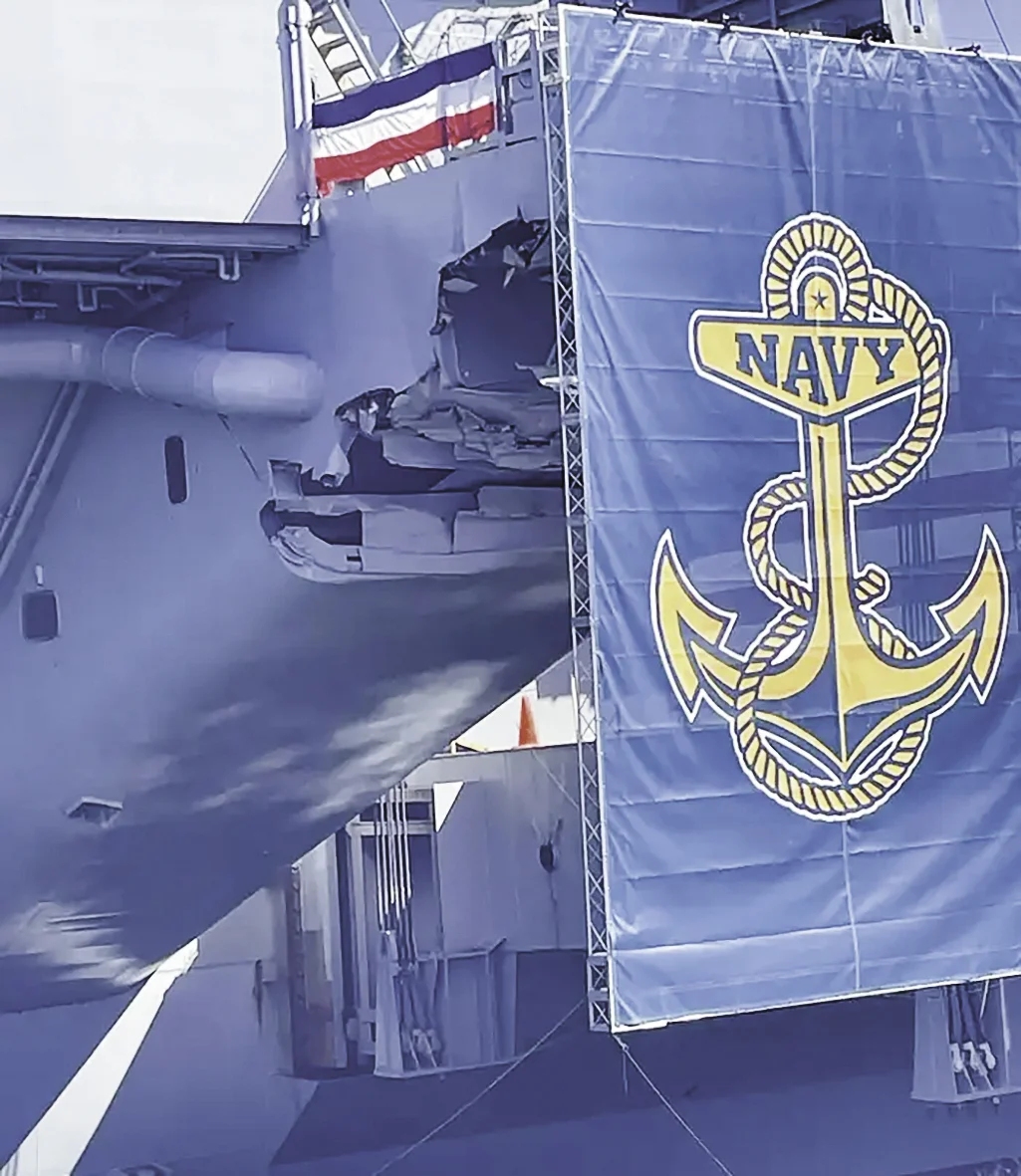 一张海报,遮住了“杜鲁门”号航母的撞伤,却遮不住美国海军日益严峻的困境。10月5日,在美国海军成立250周年庆典上,水兵们用创意方式掩盖了一个尴尬的事实——总统特朗普身旁的巨幅海报后方,是“杜鲁门”号航母8个月前撞船造成的损伤部位。