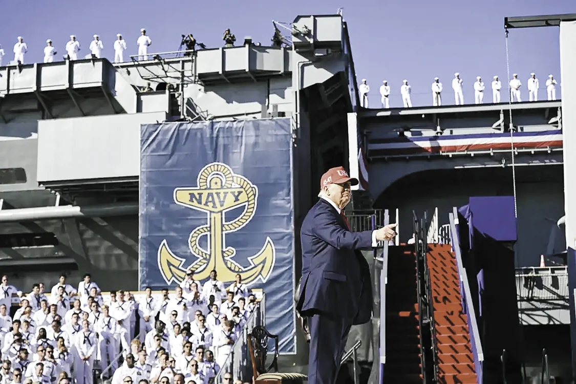 庆典当天,诺福克海军基地洋溢着喜庆气氛。特朗普站在“杜鲁门”号航母前,歌颂着美国海军的辉煌。