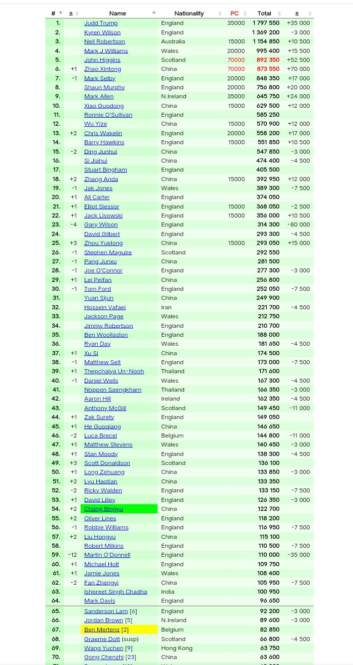 世界前四没有变化,特鲁姆普本站与希金斯打满11局失利,无缘赛季第三次决赛,依旧霸榜,领先第二名凯伦43万积分。虽然凯伦在本赛季豪取上海大师赛与大师赛两冠,但都是邀请赛,而他本赛季还没有打进一站排名赛决赛,以致卫冕冠军也没有资格出赛。在沙特阿拉伯大师赛豪取50万英镑奖金积分的世界第三罗伯逊遭遇一轮游,大比分1-6希金斯。