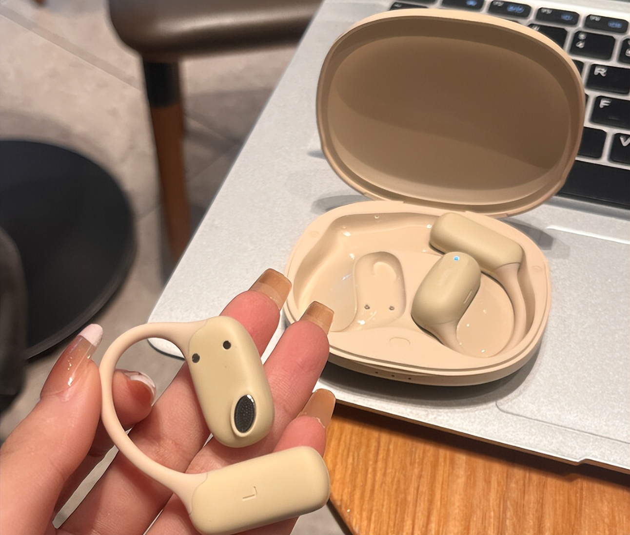 整个机型设计偏实用路线,硅胶材质亲肤,耳挂弧度贴合,戴上挺稳的。9.9克的重量很轻,通勤、运动戴几个小时都不累,不过出汗后偶尔需要调整一下。音质方面,人声很清楚,听歌、看视频对白很自然,但低音确实弱了点,听电音、摇滚时缺了点气氛。防漏音做得不错,正常音量下旁边人听不到,私密性有保障。