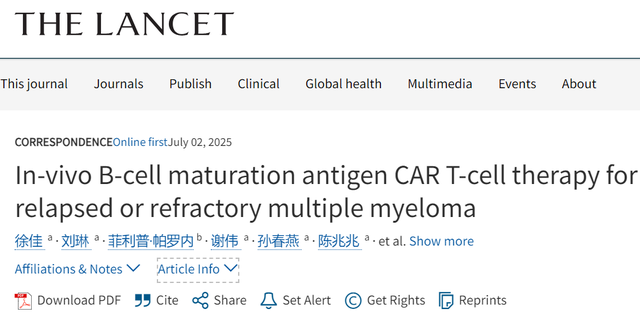 2025年7月2日,武汉协和医院的研究团队在国际顶级医学期刊《The Lancet》上报道了全球首次直接在患者体内制备CAR-T细胞治疗复发/难治多发性骨髓瘤的临床研究成果。4名复发/难治性多发性骨髓瘤患者均取得积极效果。