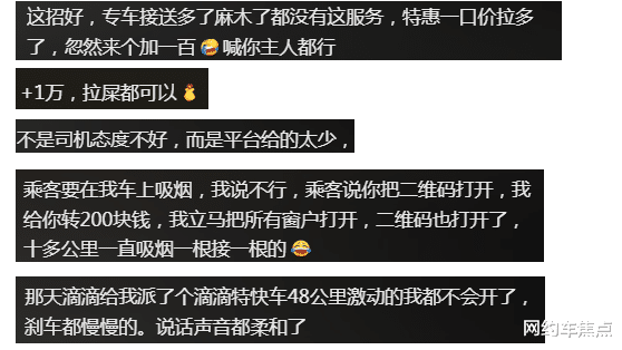 话糙理不糙,有人在评论里直言,要是乘客价钱到位,别说容忍搭脚、迟到,就算在车上拉屎都能忍着,还得客客气气的,碰到大单乘客,说话语气都会轻柔不少,更别说会有态度恶劣的事。