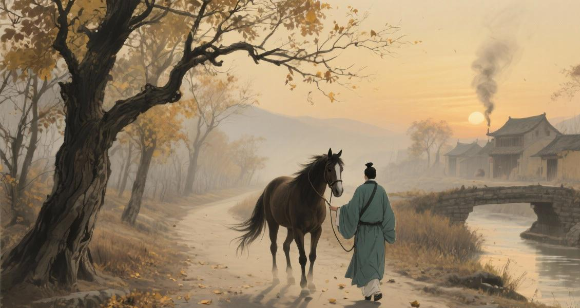 这种“意象叠加”的手法,不是马致远凭空创造的,早在唐诗里就有,比如“鸡声茅店月,人迹板桥霜”。但马致远把它玩到了极致,5组意象像电影镜头一样切换:远景是夕阳西下,中景是古道瘦马,近景是枯藤老树,还有“人家”这个隐性的参照物。清代文学家王国维在《人间词话》里说它“寥寥数语,深得唐人绝句妙境”,就是因为这28个字里的画面,比很多长篇大论都更有冲击力。