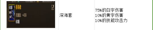 深海套特点:超高的的白字伤害,再加上其他伤害加成,伤害加成独一档,版本T0套毋庸置疑。