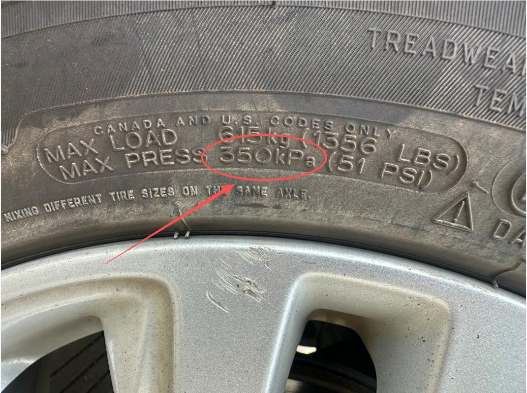 我圈出来的这个数值就是轮胎的最大可充气气压。
