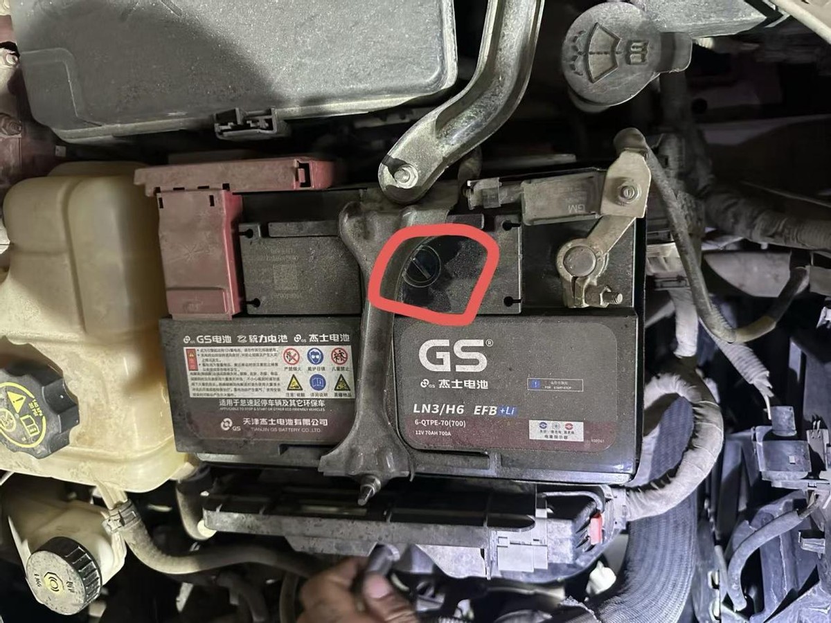 我用红笔圈出来的这个就是电眼,这是一个透明的洞,能直接看到电瓶内部的情况。