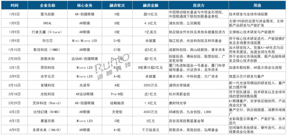 整机端有雷鸟、XREAL、行者无疆等头部厂商亿元级的大额融资,也覆盖了运动眼镜、办公空间计算、民用配镜等垂直细分赛道;同时,4月涌现比特幻境等初创天使轮新项目,赛道多元化发展趋势明确。