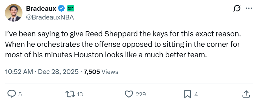 面对谢泼德这样的表现,火箭媒体Bradeaux直言休城早就应该将进攻指挥权交给谢泼德。