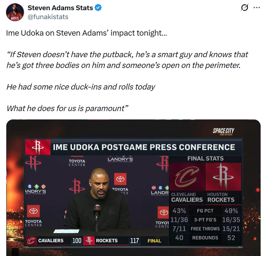 同时亚当斯与卡佩拉都是实打实的5号位,防守端也能提供稳固的篮板与护框表现,火箭队完全不必采取双塔策略,球队空间自然打开。