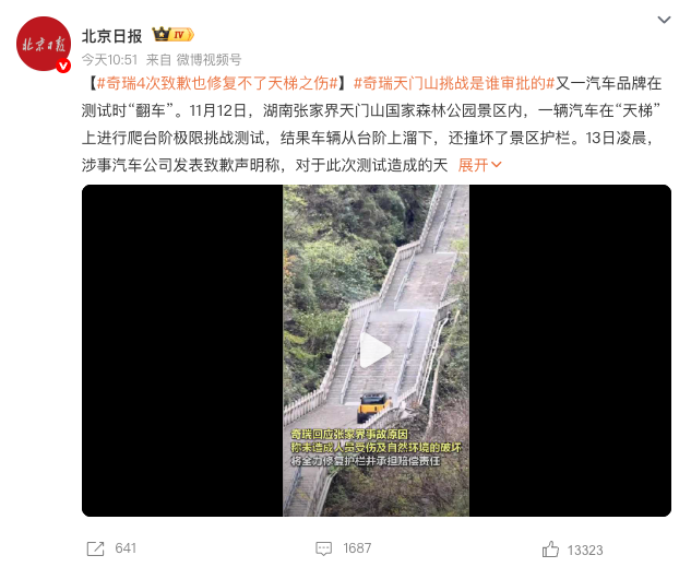 2025年11月12日,奇瑞风云X3L在张家界天门山999级天梯的极限爬坡测试突发意外,车辆溜滑撞击护栏的视频迅速引爆全网。尽管奇瑞于13日凌晨连发四次致歉声明,却仍难平舆论怒火,更被《北京日报》指责“4次致歉也修复不了天梯之伤”。