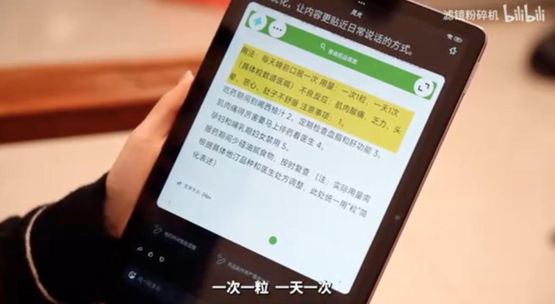 女孩和外婆坐在一起,将外婆家中几十种备用药和保健品的名字一起输入 AI 助手的对话框,AI 根据药品说明书自动整理好了药名、适应症、用法用量、不良反应等关键信息,还根据外婆的实际用药情况,将用药指引简化成了“一次几粒、一天几次”这样的口语,此外,小应用还添加上了药品保质期管理,外婆的每一种药,现在都有了清晰的使用期限倒计时。