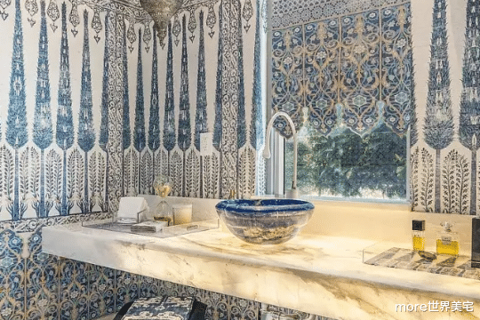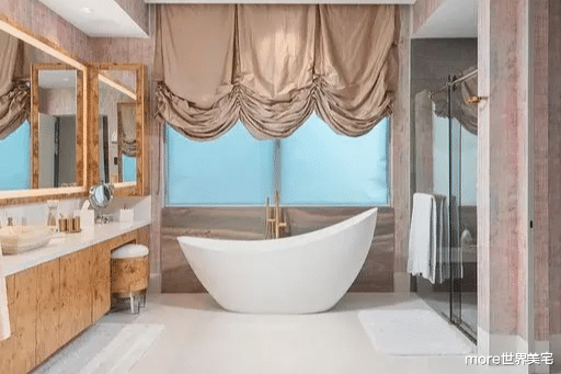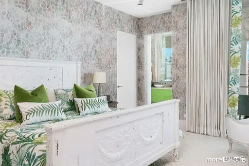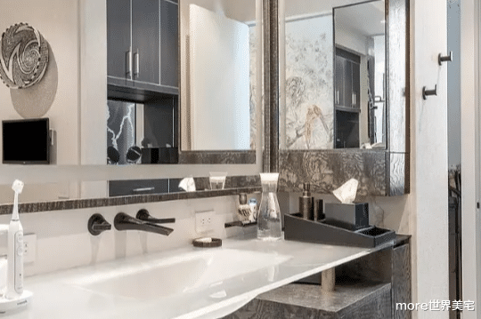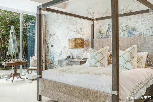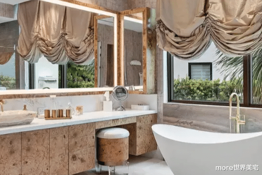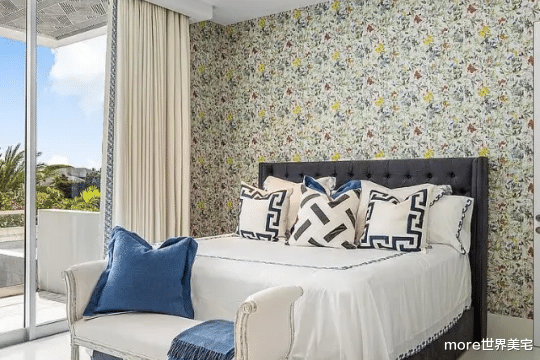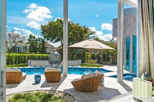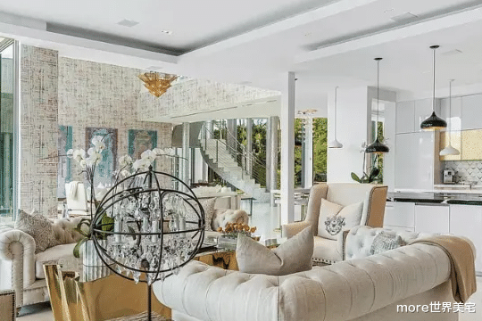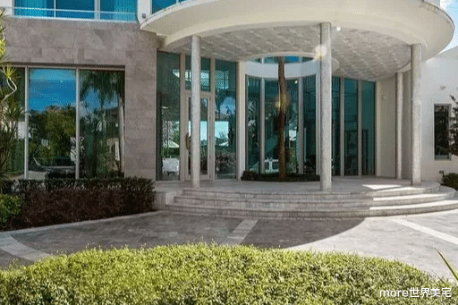 该住宅占地约5,000平方英尺,采用开放式平面布局,包含5间卧室、5间完整浴室及2间半浴室。建筑主体以流畅的曲线造型与现代几何线条相结合,大面积玻璃幕墙系统确保全天候自然采光。特别设计的拱形门廊与大理石圆形车道构成标志性入口,车道表面采用特殊石材拼接工艺,与门廊的挑高式设计形成视觉呼应。