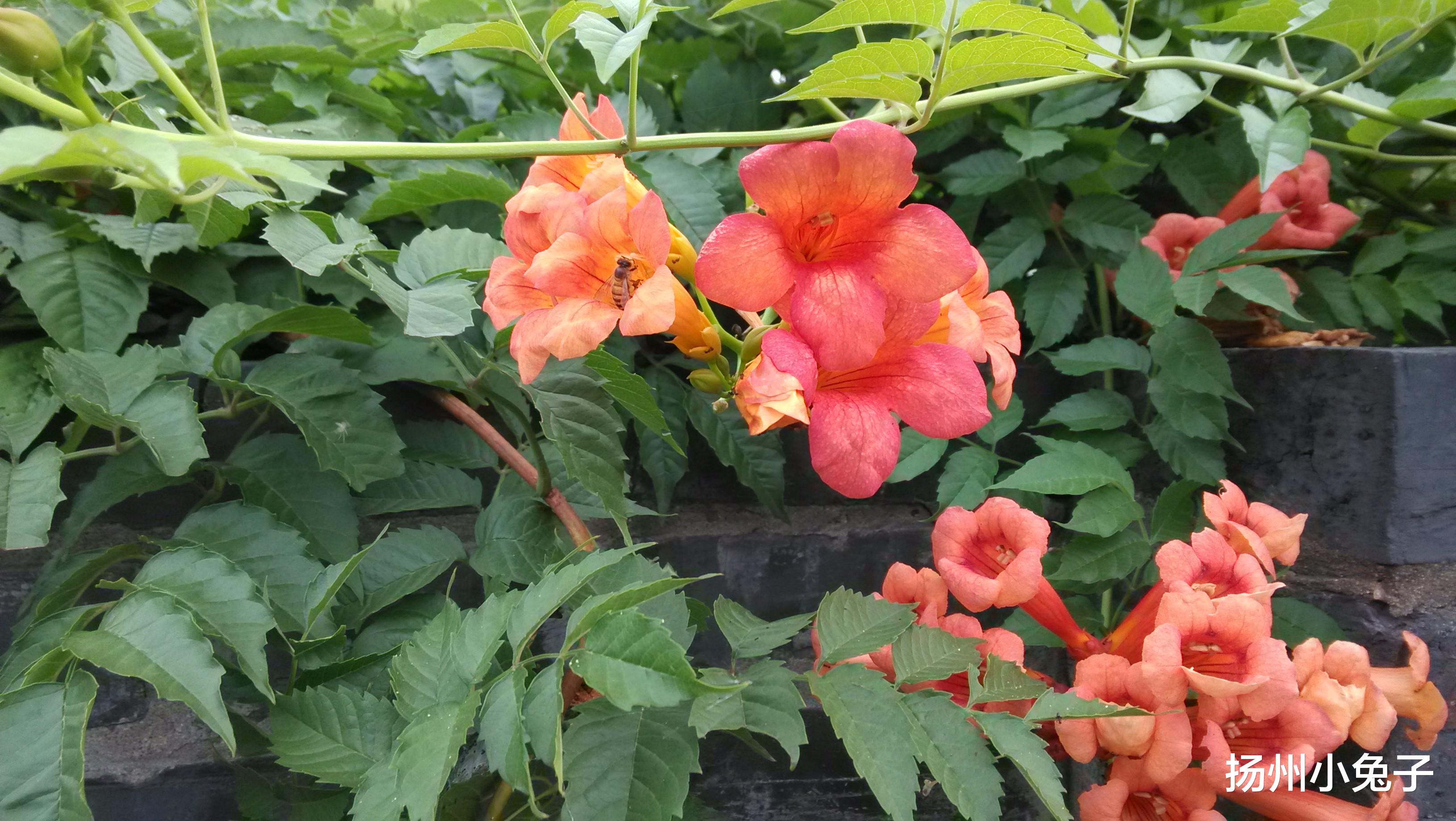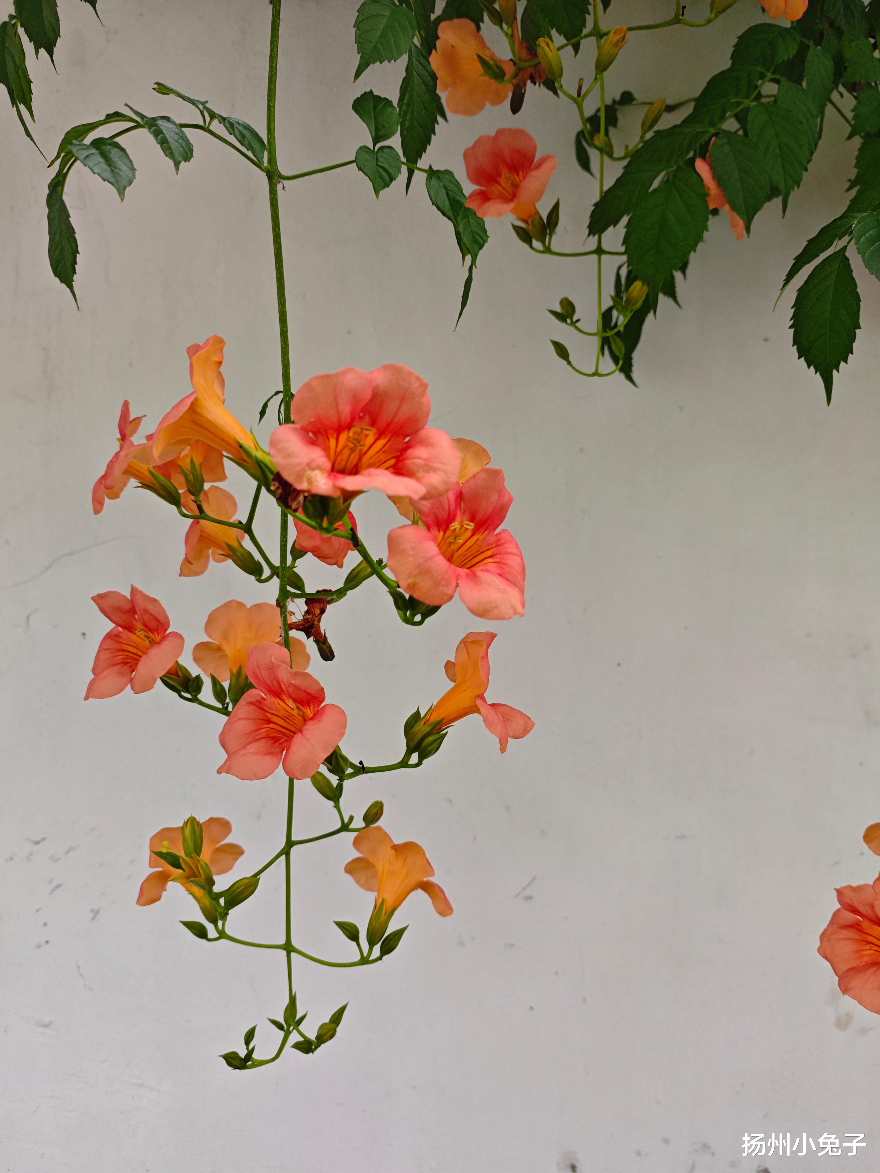 不知为什么,感觉今年的日子过得特别快。昨天出门,忽然发现,大街上很多地方,都有盛开的凌霄花了。扬大水利学院,直接用凌霄花做了满墙花。绿绿的藤,橙红色的花交相辉映,端的个美啊。