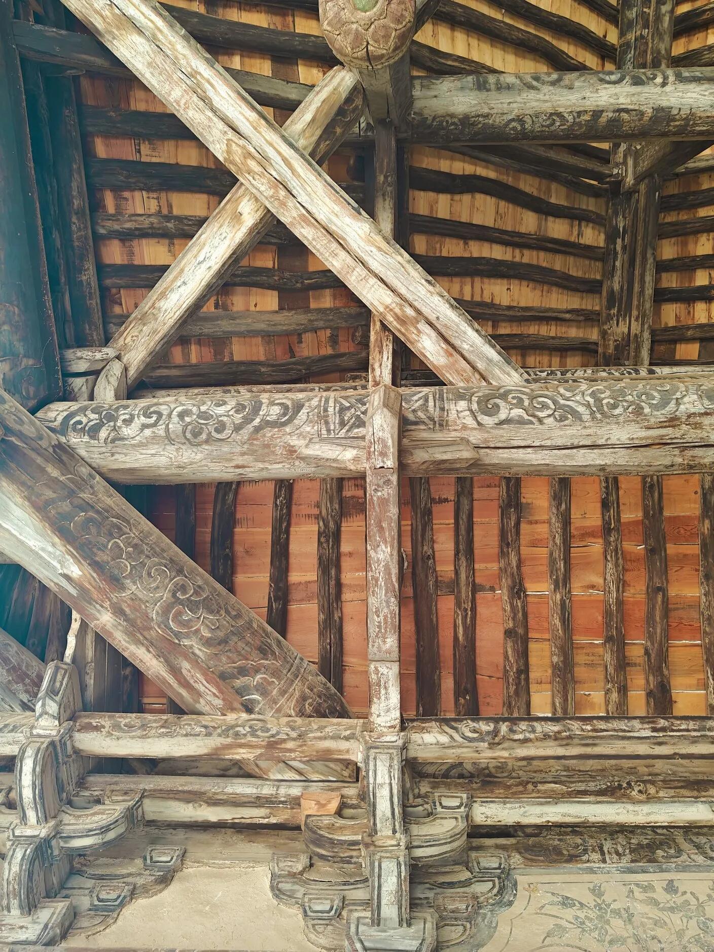 坐在殿内的台阶上歇脚时,阳光透过窗棂照进来,在壁画上投下斑驳的光影,那些残存的图案仿佛活了过来。村里的老人说,这座大殿建于明成化三年,算下来已有五百多年历史,这么多年里,躲过了战火,扛过了风雨,除了偶尔的修缮,基本保留了明代的原貌。“以前逢年过节,村里的人都会来这里祭拜,后来慢慢就少了,现在只有懂行的人会特意来看看。”老人的话里带着几分惋惜,可看着殿内的“悬梁吊柱”与残存的壁画,又觉得能保存到现在,已经是一种幸运。