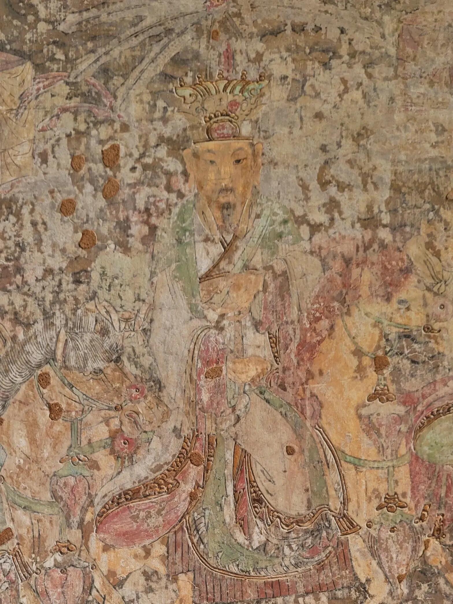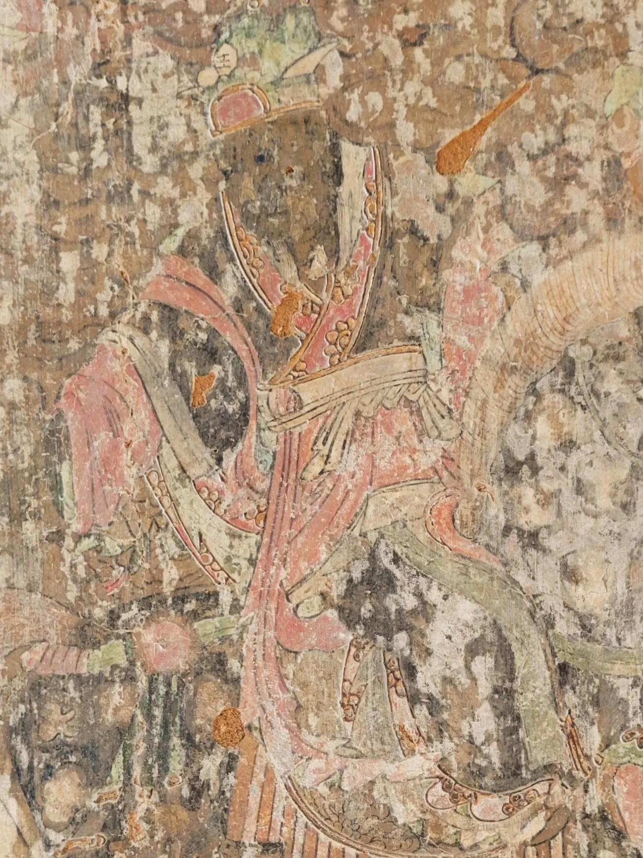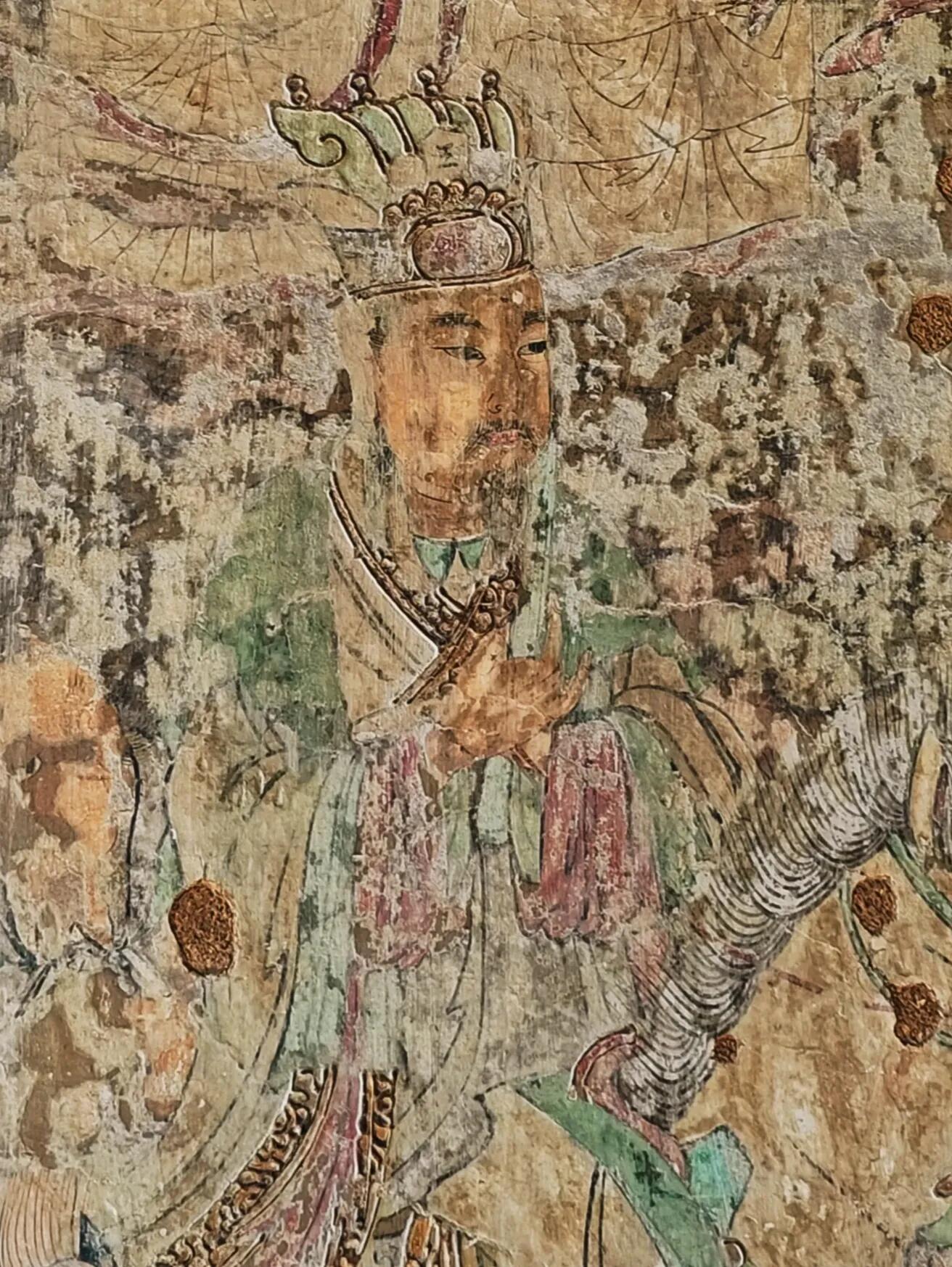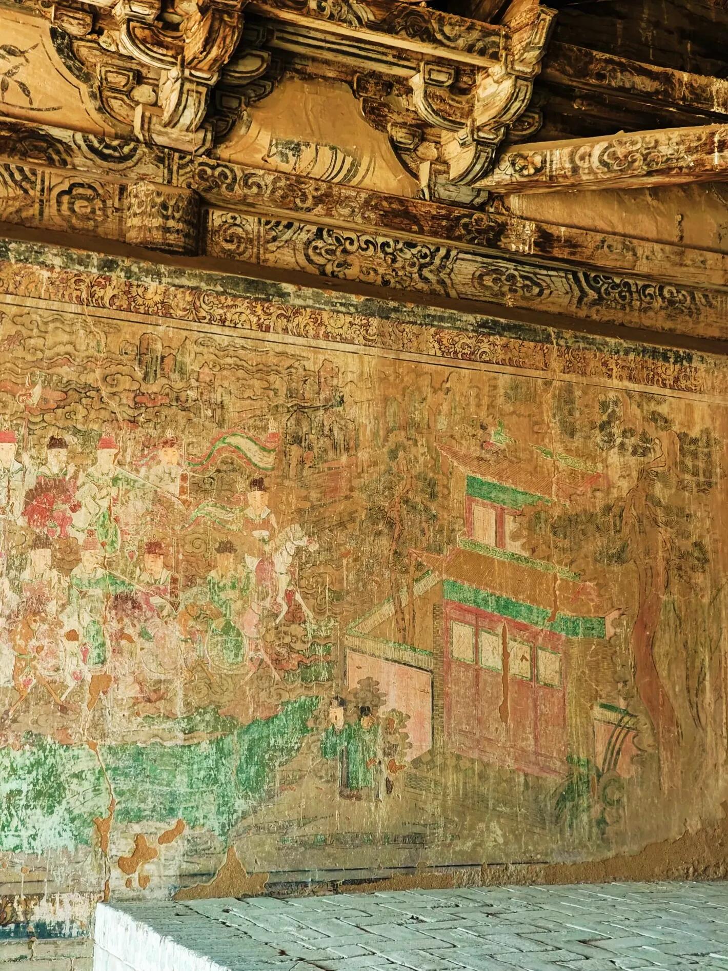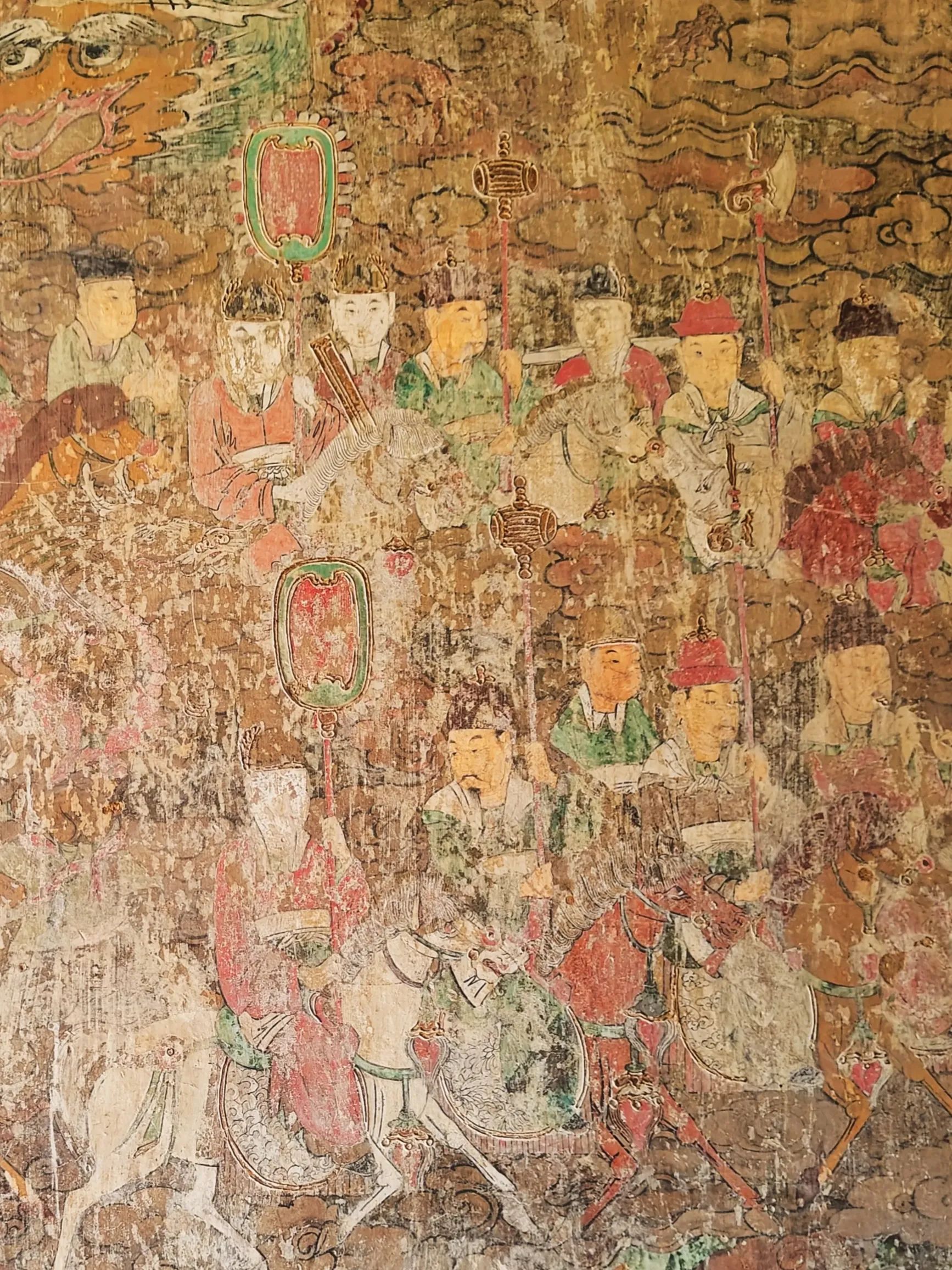 殿内三面墙上的壁画,是另一处让人惊喜的所在。虽然整体保存得不算好,可那些沥粉贴金的痕迹,还是能让人想象出当年的华丽。东墙的布雨图损毁得最严重,只能隐约看到几缕残存的云纹和模糊的人物轮廓,像被岁月抹去了大半的记忆;北墙的宴饮图也看不清细节,只能从残存的色彩里,猜测当年画的是赵武与群臣宴饮的场景;唯有西墙的回銮图保存得最好,虽然有些地方的金粉已经脱落,可画面的气势依旧不减——文武百官身着官服,手持笏板,整齐地排列着;车马随从浩浩荡荡,旌旗在风中飘扬,连马匹的鬃毛都画得格外细致。
