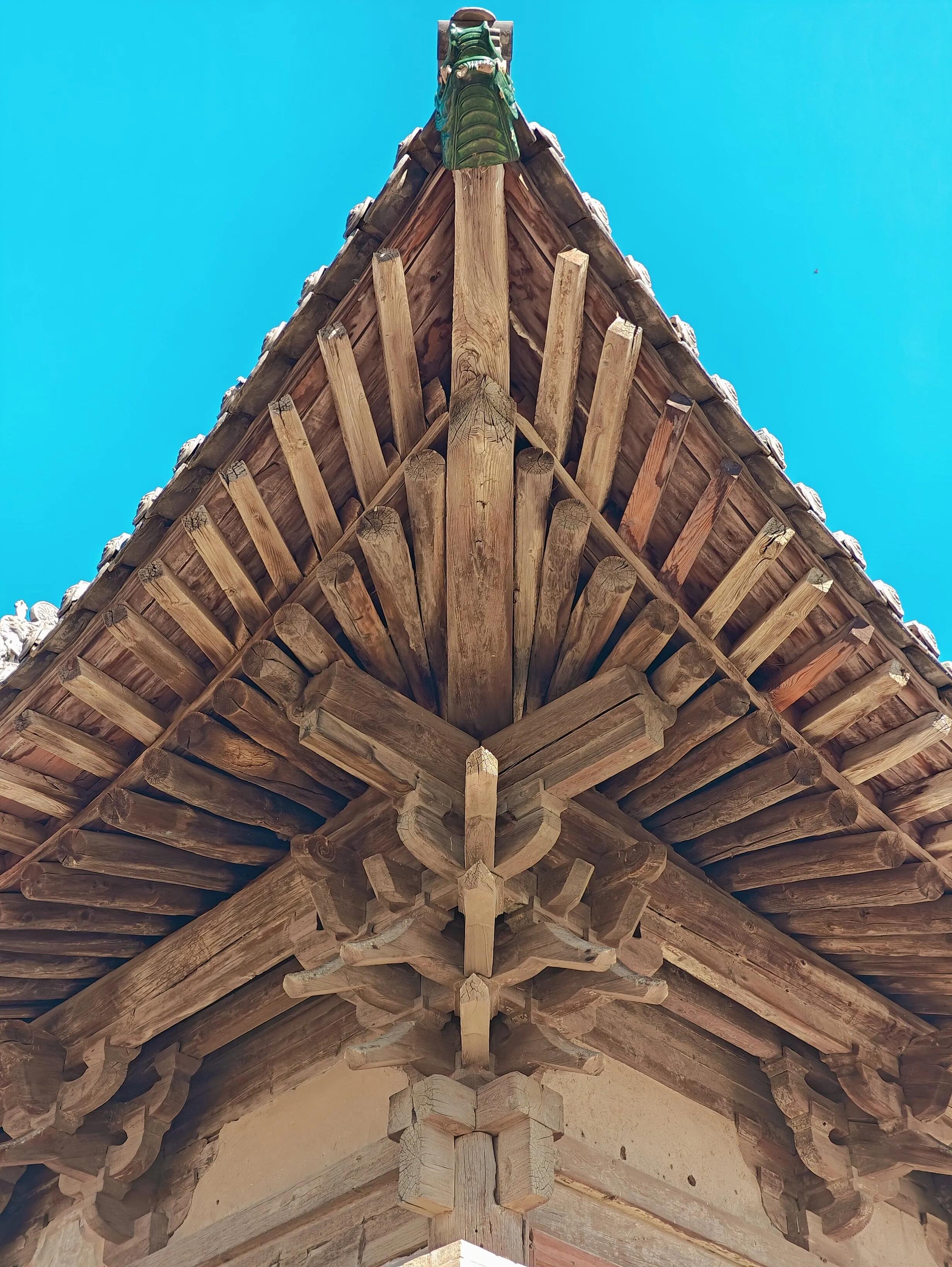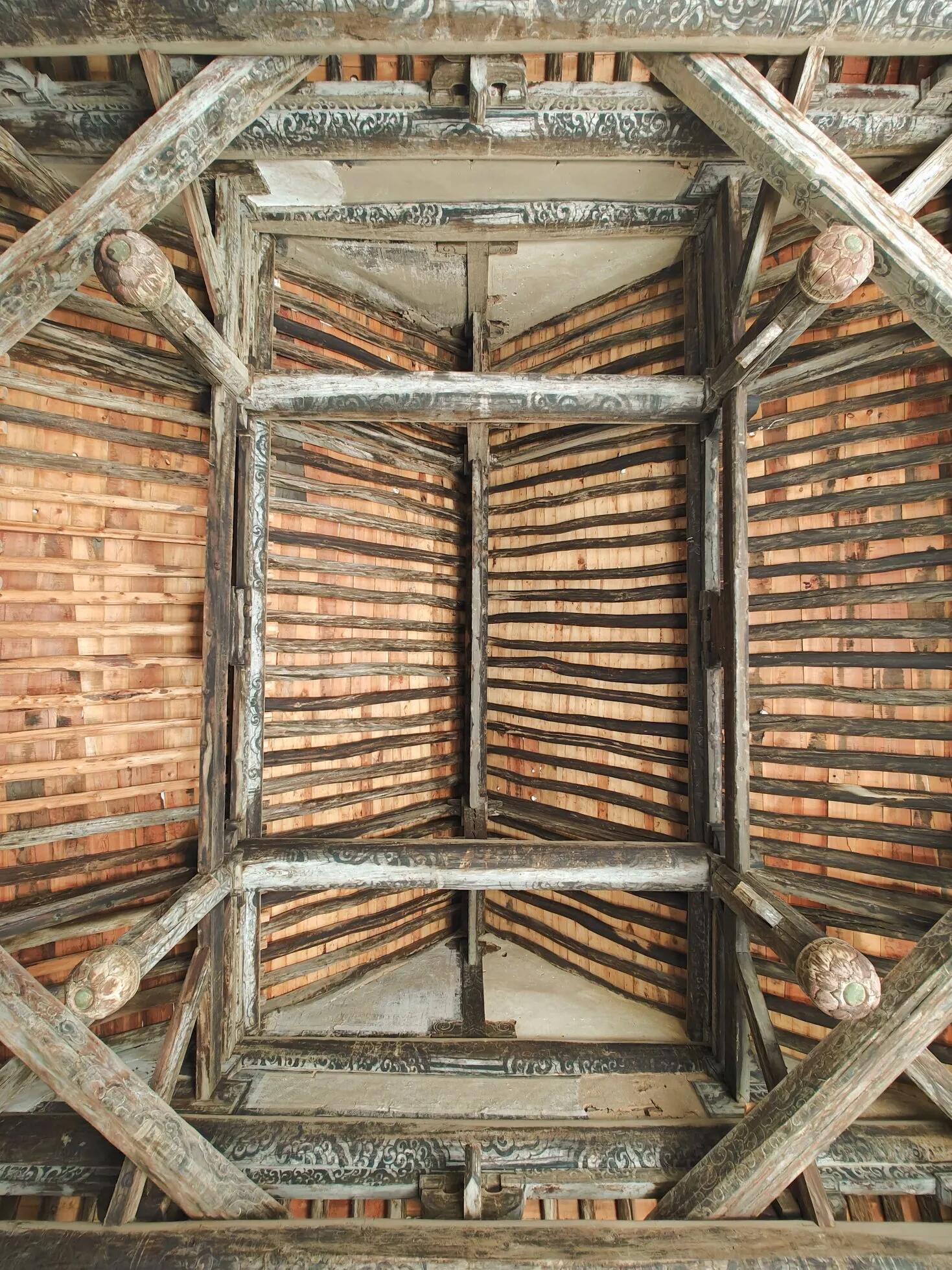 推开门的瞬间,最先感受到的是殿内的阴凉,与门外的燥热形成鲜明对比。抬头一看,瞬间被头顶的梁架结构惊住了——没有常见的立柱支撑,前后内额与四椽袱交织成“井”字方梁,四角用三层抹角梁与斗拱层层挑起井口梁,底下垂着细细的梁柱,像悬浮在空中一样,这就是传说中的“悬梁吊柱”。难怪当地人都叫它“无梁殿”,这样的结构在明代建筑里可不常见,不用一根立柱,全靠木构的咬合与力学的平衡撑起整个屋顶,不得不感叹五百年前工匠的巧思。