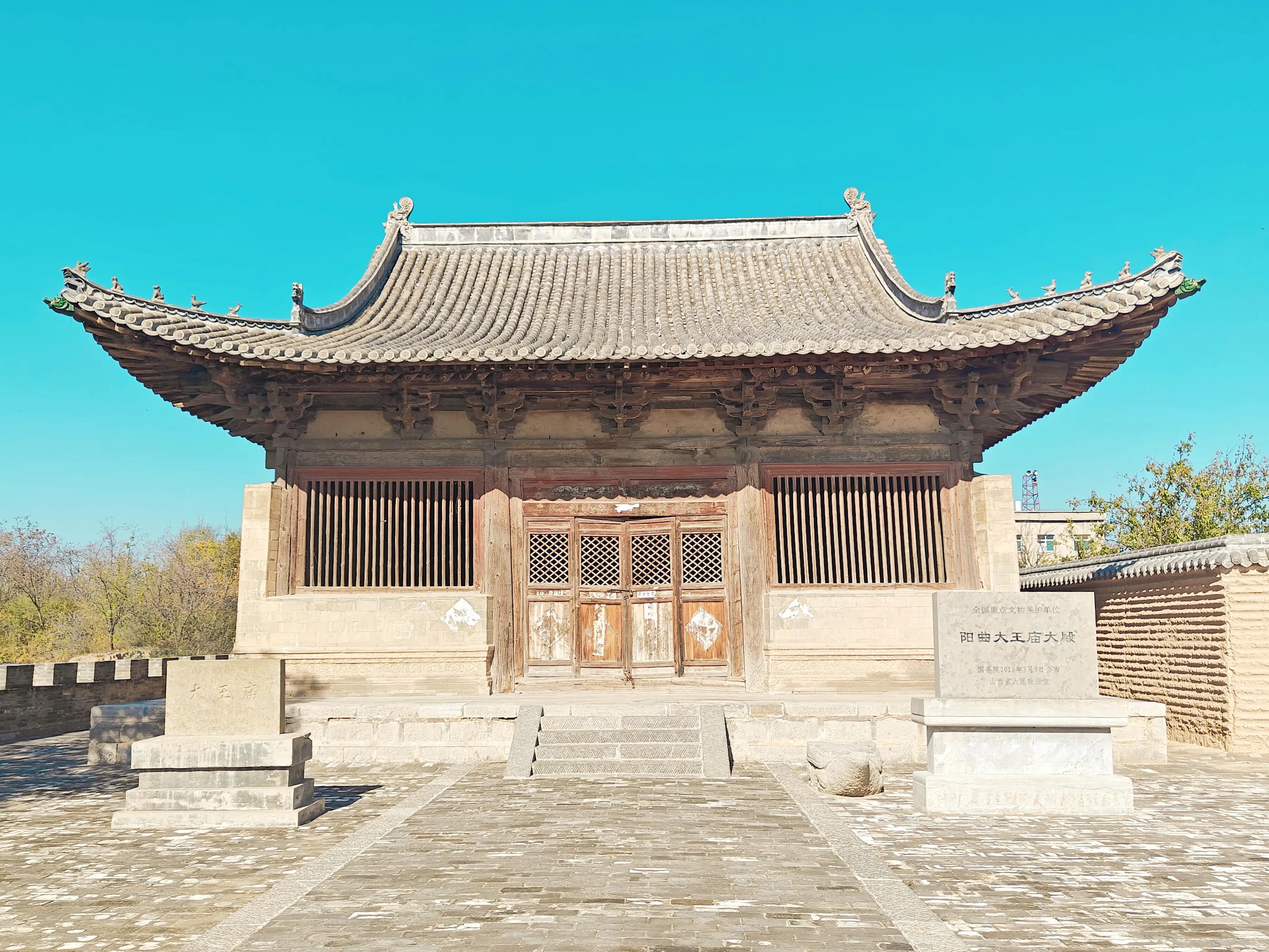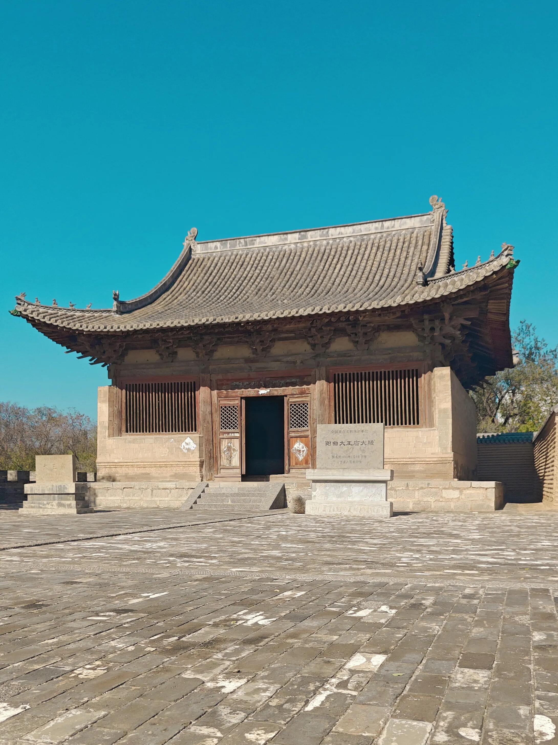 在山西阳曲的范庄村逛了大半天才找到大王庙时,正午的太阳正烈,村口的老槐树投下斑驳的影,而那座孤零零的大殿就立在村东的高地上,青瓦灰墙,单檐歇山顶的轮廓在蓝天底下格外清晰。早听说山西的国保单位多到“扎堆”,可这座仅凭一座大殿就入选第七批国保的大王庙,还是让我生出了几分好奇——究竟是什么样的底气,能让它在遍地古迹的山西站稳脚跟?