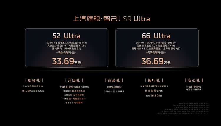 近日,智己汽车旗下全新大型SUV LS9正式开启预售,两款配置车型的预售权益价分别为33.69万元和36.69万元,新车将于11月12日正式上市,Hyper版本则计划在2026年一季度推出。作为品牌旗舰车型,智己LS9在动力、底盘、智能配置等方面均展现出差异化竞争力。
