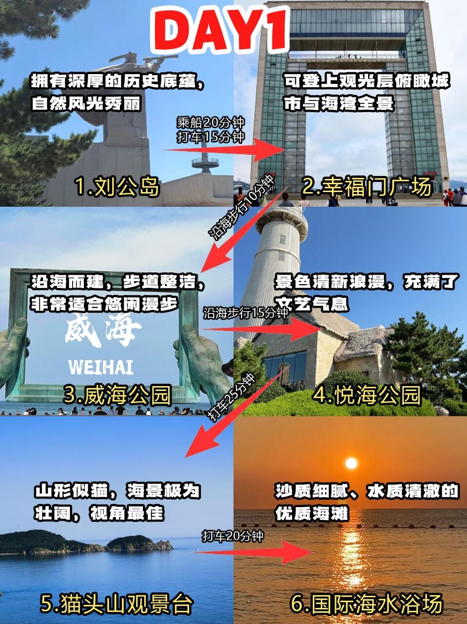 ☀️Day1:刘公岛→幸福门广场→威海公园→悦海公园→猫头山观景台→国际海水浴场