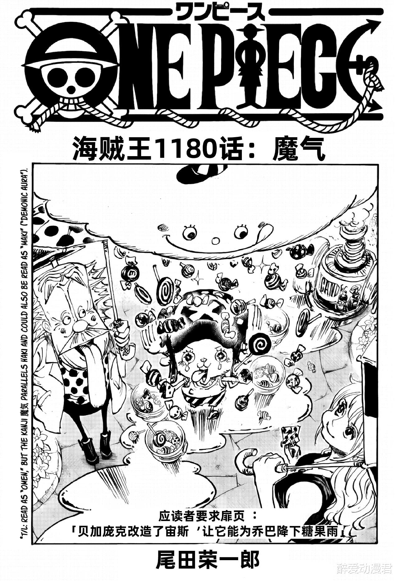 我们知道本周更新了海贼王最新一期的漫画1180话,目前漫画已经更新,本话标题为“魔气”算是伊姆的一个重要攻击手段。扉页则是贝加庞克给乔巴制造了可以下糖果雨的雷云宙斯。