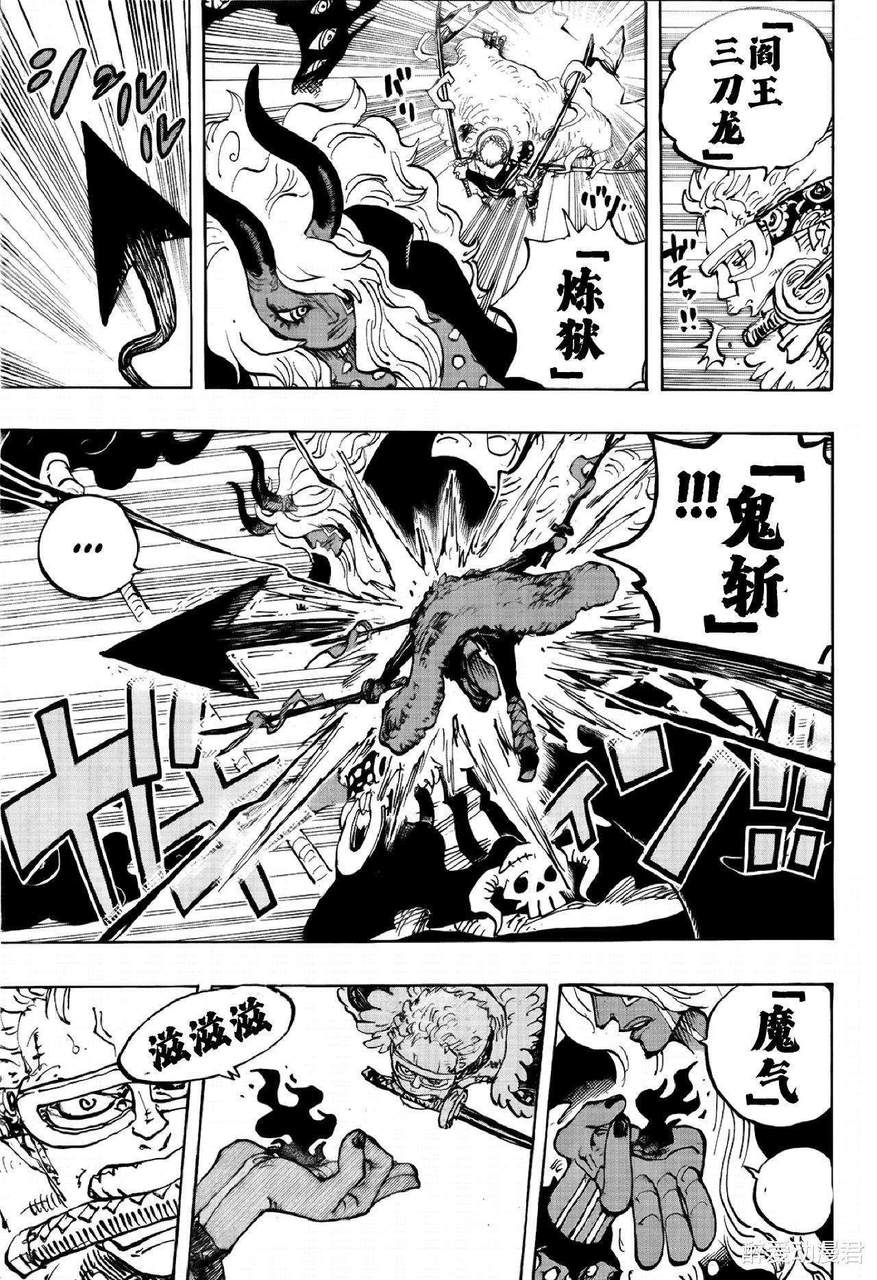 索隆见此直接开大,阎王三刀流炼狱鬼斩,直接出手对上了伊姆。可惜被伊姆的尾巴给挡住了攻击!