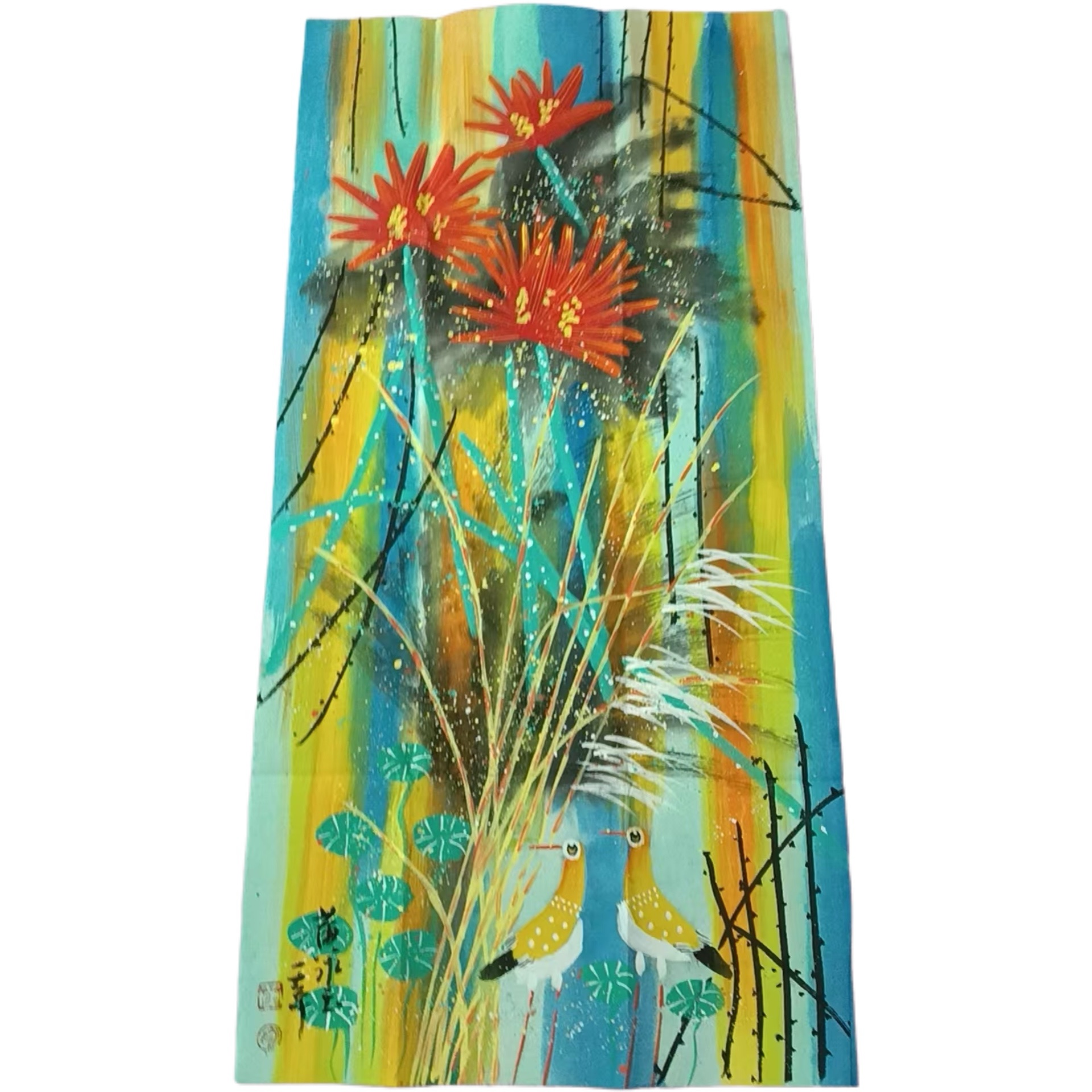 风格典型:作品完美契合 “黄氏荷塘” 的核心特征 —— 荷花造型夸张(花瓣如火焰般舒展),色彩对比强烈(红荷与蓝绿背景碰撞),线条如书法般富有韵律(荷茎的穿插、禽鸟的轮廓),是研究 “黄氏风格” 的绝佳样本;