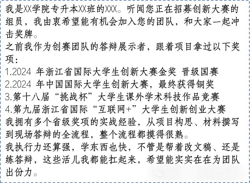 但转念一想,如果我作为创赛的负责老师,光看这份介绍,真的会立刻想邀请她进团队吗?好像有点犹豫。不是孩子不够优秀,而是这份介绍只“罗列了成果”,却没说清最关键的事:她的优势到底是什么?能为团队做什么?老师要花额外的时间去“猜”她的价值,沟通成本一下就高了——毕竟老师手里可能十几个甚至几十个人选,没理由花太多时间去挖掘一个“信息模糊”的候选人。