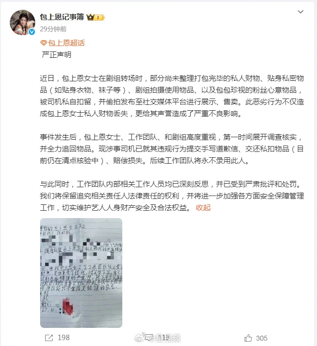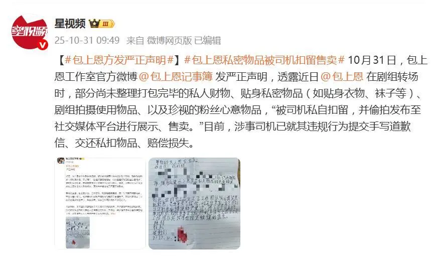 事件曝光后,包上恩团队与剧组第一时间介入调查,仅用24小时就锁定涉事司机。目前对方已提交手写道歉信,交还了全部私扣物品(仍在清点核验中),并支付了相应赔偿,最终被团队永久拉黑、永不录用。与此同时,工作室内部因 “监管失职” 被追责,相关工作人员遭到严肃批评处罚。看似 “快速闭环” 的处理,却点燃了公众的怒火。