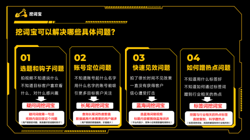 这就是疑问词挖词宝。精准定位用户需求和痛点,帮助大家精准选题、选钩子,使用了疑问词挖词宝,再也不用担心不知道拍什么了,不知道拍什么用户喜欢了。