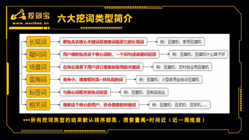 除了疑问词挖词宝,还有蓝海词、场景词、标签词和相关词。