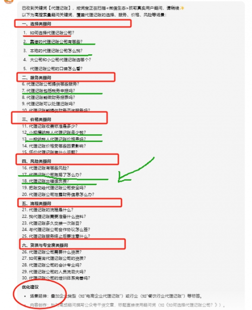 大家可以看到这个图片里面的内容非常丰富,不仅搜索出来关于代理记账的排名前30的问题,还对问题进行了分类。用户的需求和痛点一目了然。