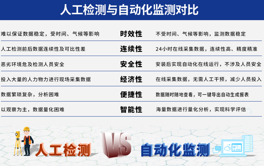 自动化监测实现无人值守自动化在线监测,不但省时省力,而且监测精度和实时性得到大幅提高,在遇到突发情况时,及时声光报警提示,大大的降低了安全系数。