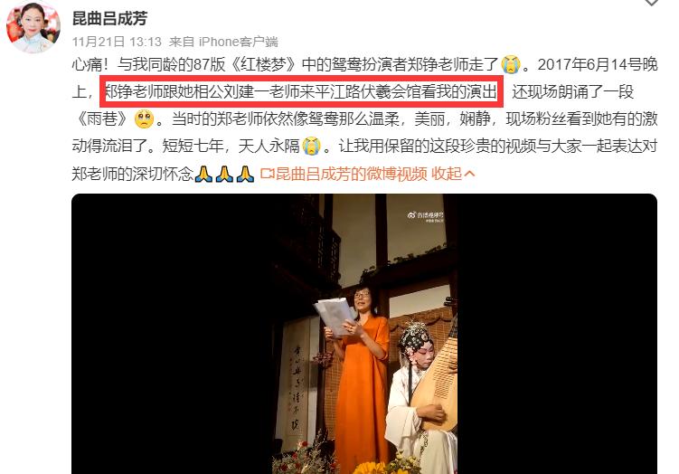 11 月 20 日,演员郑铮去世的消息被各大媒体竞相报道,郑铮生前因饰演经典版《红楼梦》里的“鸳鸯”被观众熟识,年仅 61 岁却溘然离世,实在令人感到悲痛与惋惜。
