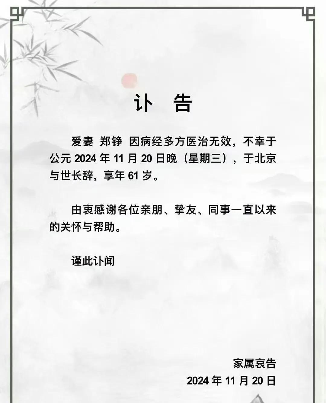 据悉,郑铮生前罹患肺癌,一直以来积极与病魔做抗争,正如其丈夫在讣告中所言的,郑铮生前经过了各方救治,最终还是没能留住宝贵的生命。