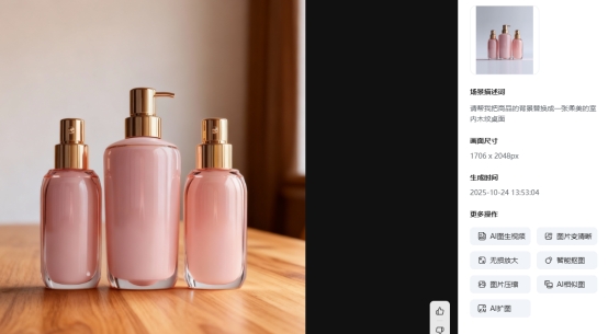 AI万能改图支持一键式自动背景替换,操作极其简便:您只需要在指令描述框里填写简洁明了的文字内容就可以说明你需要将图片里的哪个地方给替换掉比如“请帮我把商品的背景替换成一张柔美的室内木纹桌面”。然后AI就会根据你所指定的内容找到商品主体并生成与商品本身相吻合的光影关系及光照方向的全新背景。