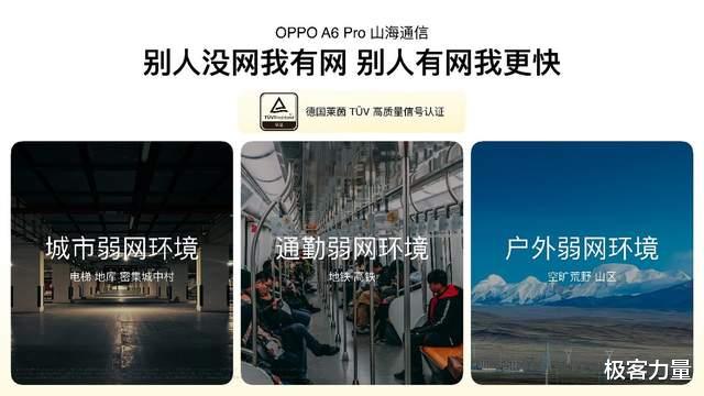 OPPO A6 Pro 采用旗舰级山海通信全套解决方案,带来行业最强弱网通信体验。针对地库、电梯、山区等信号薄弱场景,山海射频天线通过天线设计革新,低频信号收发能力提升 200%,整体信号强度达前代 2 倍。配合山海弱网加速引擎,智能切换最优频段,以及山海无网通信,实现“别人没网我有网,别人有网我更快”的流畅体验,并获得手机行业首个德国莱茵 TÜV 高质量信号认证。