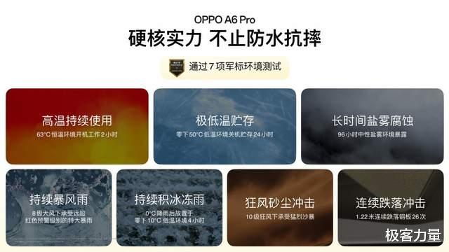 抗摔能力上,A6 Pro 采用了高强度航空合金骨架与 OPPO 晶盾玻璃构成的超抗摔金刚石架构,成功通过包括高温、极低温、长时间盐雾腐蚀等 7 项军标环境测试,从容应对日常跌落与磕碰,真正做到“横竖里外都抗摔”。