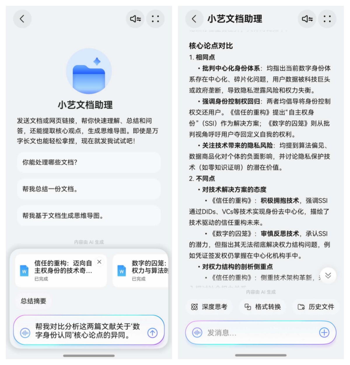 年底各种几十页的行业报告、上百兆的会议纪要纷至沓来,看着就头大。这时候小艺文档助理就能大显身手:把PDF往小艺对话框里一发,直接对它说:“帮我生成思维导图”或者“总结摘要”。很快,就能得到一份逻辑清晰的脑图或者精炼的核心观点,它甚至还能辅助生成PPT大纲,对于咱们这种需要快速输出方案的人来说,这哪是功能,简直就是“续命”神器。