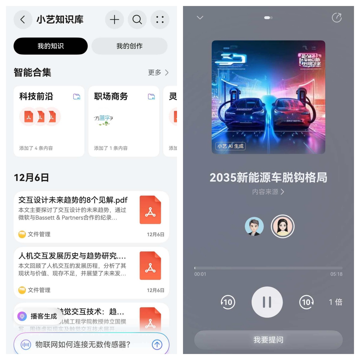 最让我觉得“黑科技”的,是它的AI播客功能。有时候通勤路上眼睛累了不想看字,直接把小艺知识库里收藏的长文或者行业报告转换成播客。它不是机械朗读,而是能像电台节目一样,把枯燥的内容变成有趣的对话。一边赶路一边听知识,碎片时间也能给自己充电。