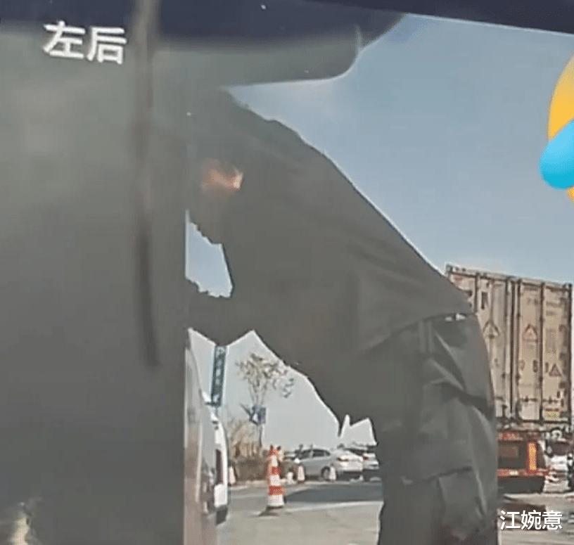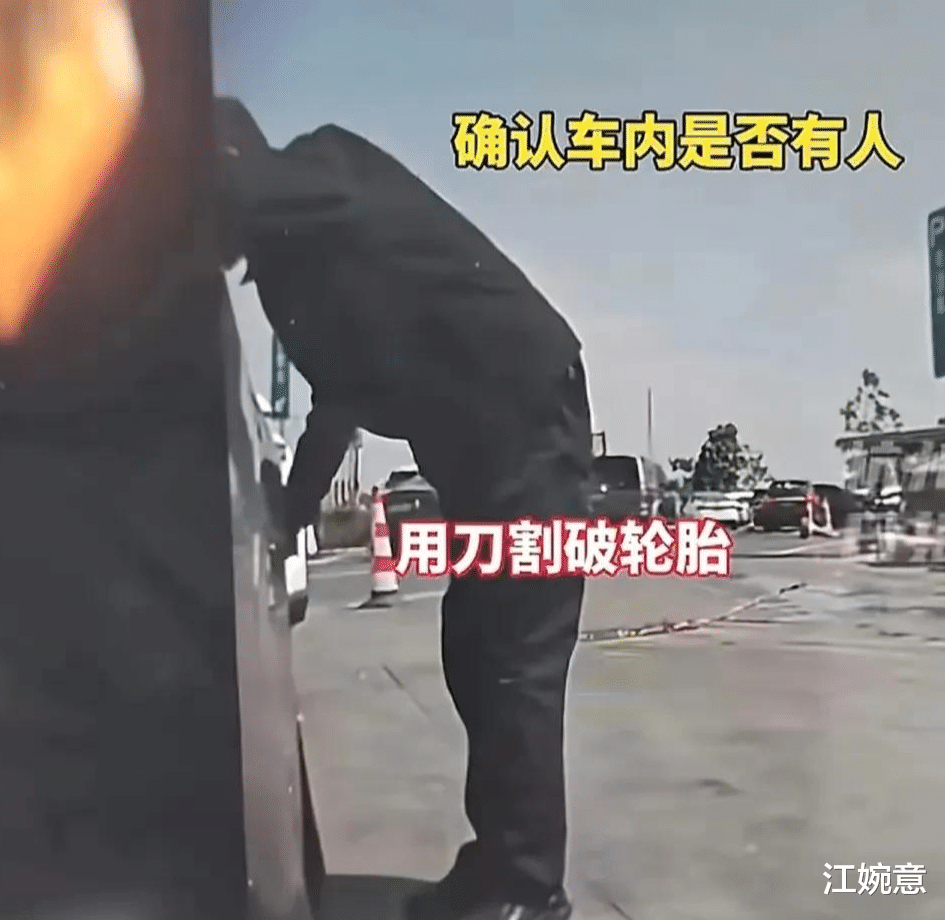 于是赶紧进入车内通过车内大屏查看监控,发现正是刚刚那位询问自己要不要补胎的黑衣男子,在自己上厕所时,大摇大摆的走到自己的车前,趴在车窗上看了一眼没人后,就用工具熟练地割破了车子后轮的轮胎。