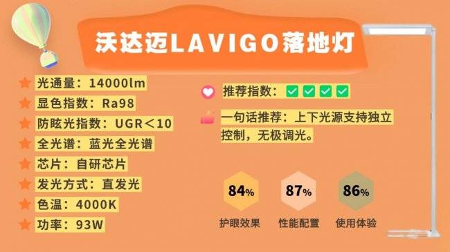 落地护眼大路灯第十名:沃达迈LAVIGO落地灯;光通量约14000lm,整体亮度比较充足。