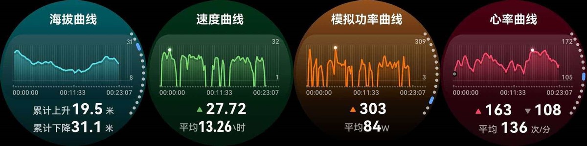 实际骑行时,手表会自动采GPS速度、实时海拔、心率、加速度等数据,再结合华为风洞实验室建立的风阻系数数据库,精准推算骑行功率。